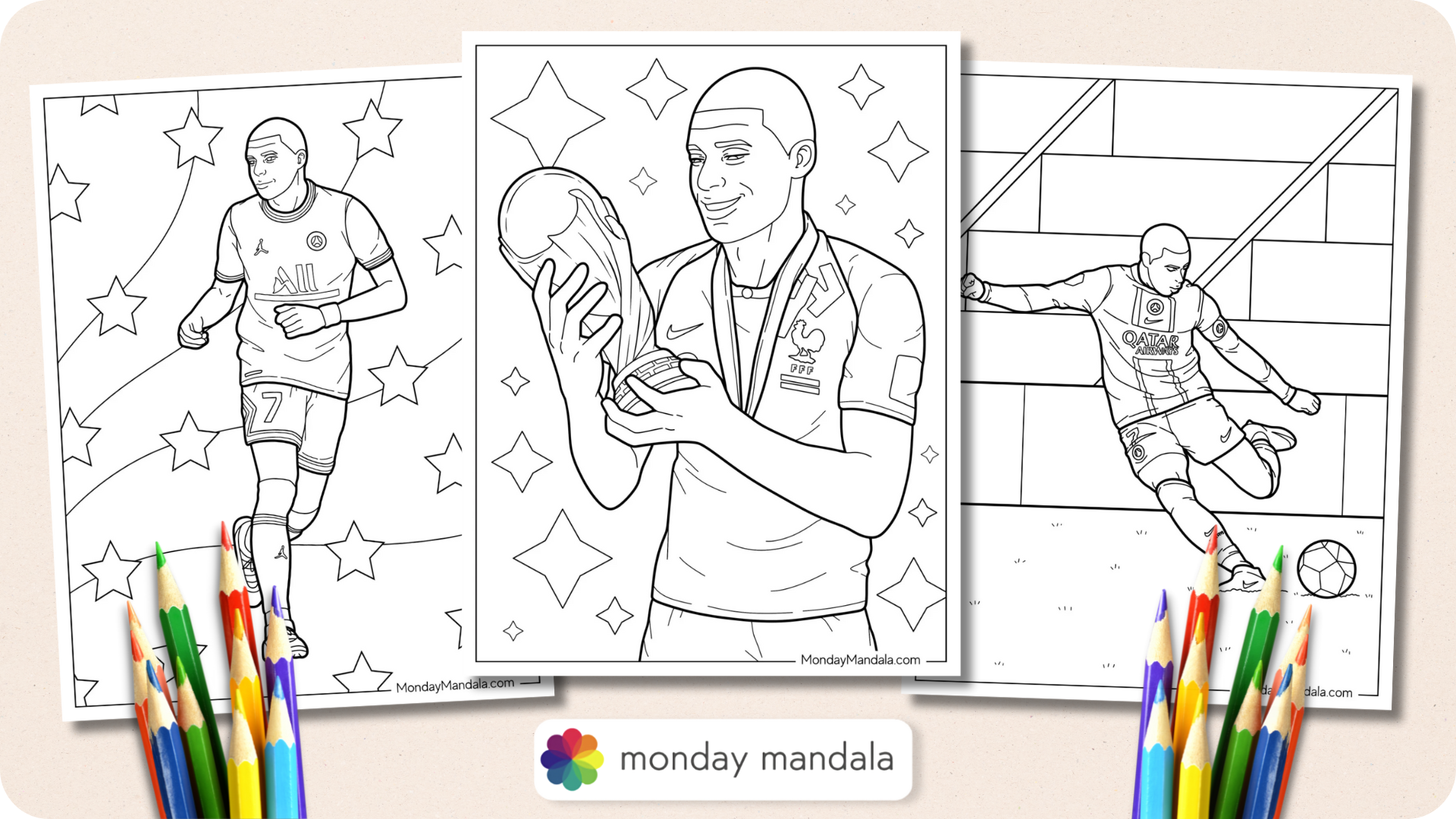 Celebrate the electrifying talent of Kylian Mbappé with these 18 coloring pages, free for you to download and print. With these sheets, you can capture the essence of one of soccer’s brightest stars, from his explosive runs on the field to his memorable goal celebrations.
